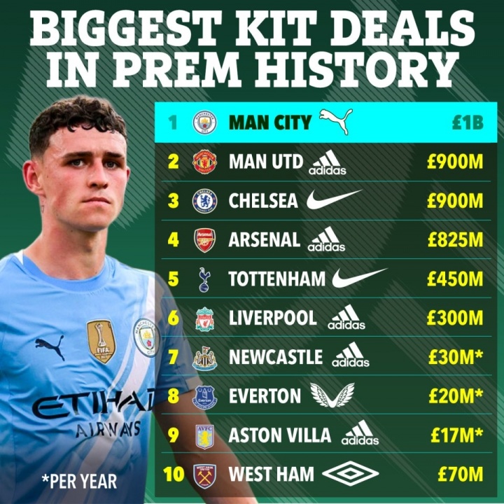 1-曼彻斯特城,彪马,10年内10亿